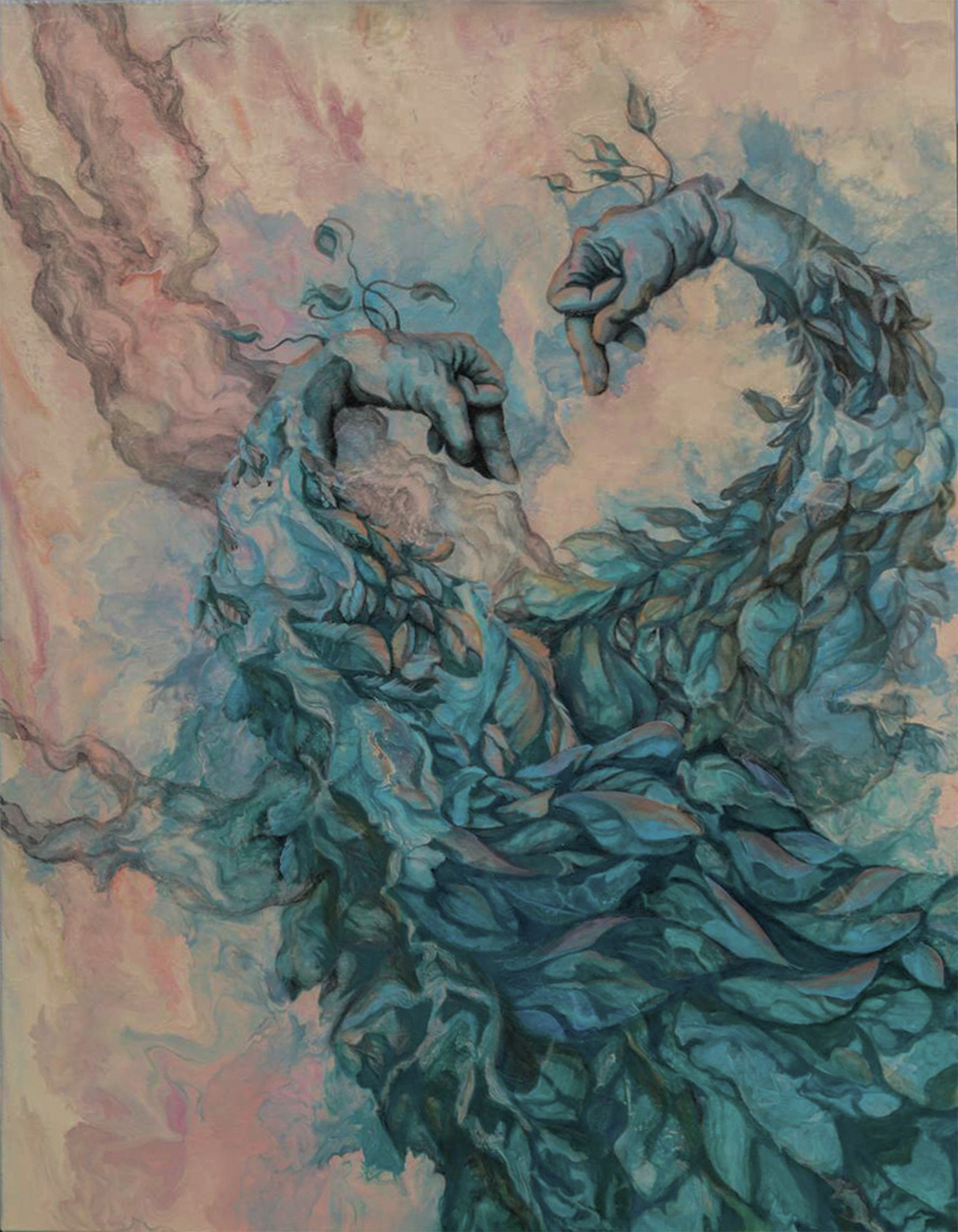 Blues and greens flow in layered, feather-like passages that guide the eye in a circular rhythm across the surface. Two hands rise within this movement, turning toward one another like bird heads in dialogue. Repeated arcs create a call and response, giving the composition a conversational structure.