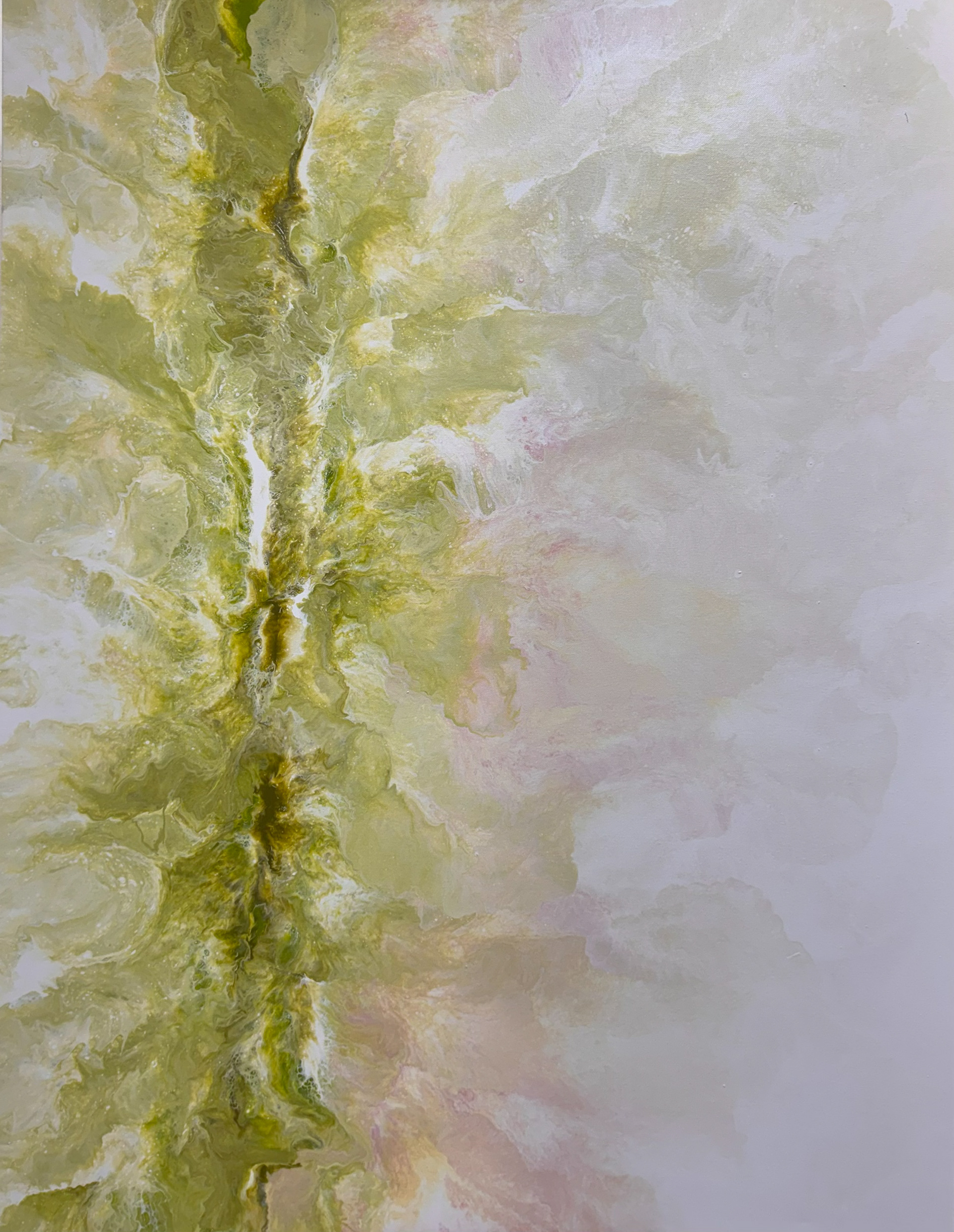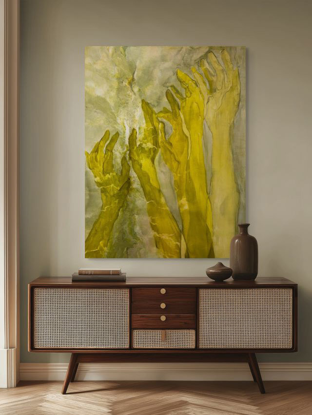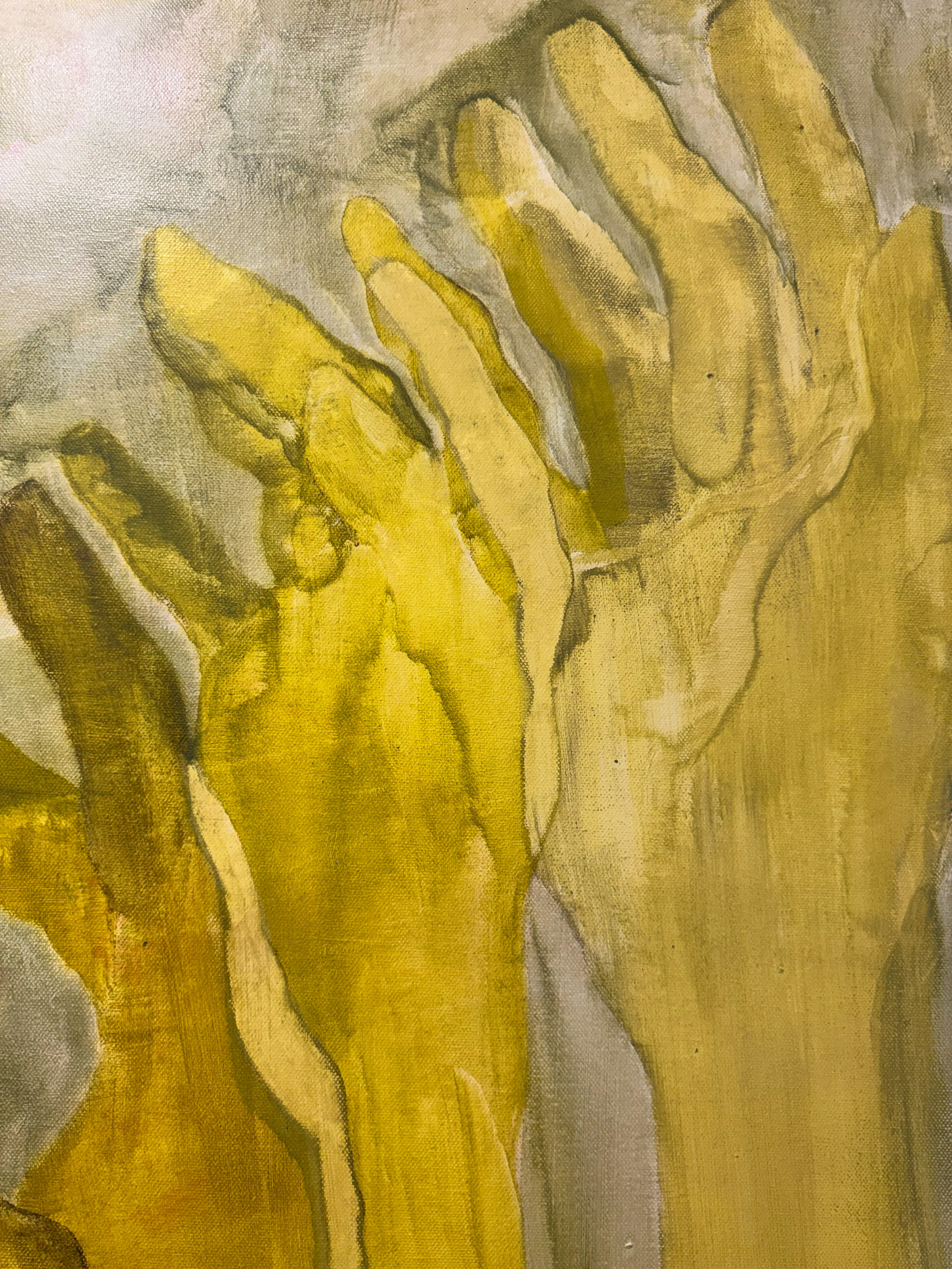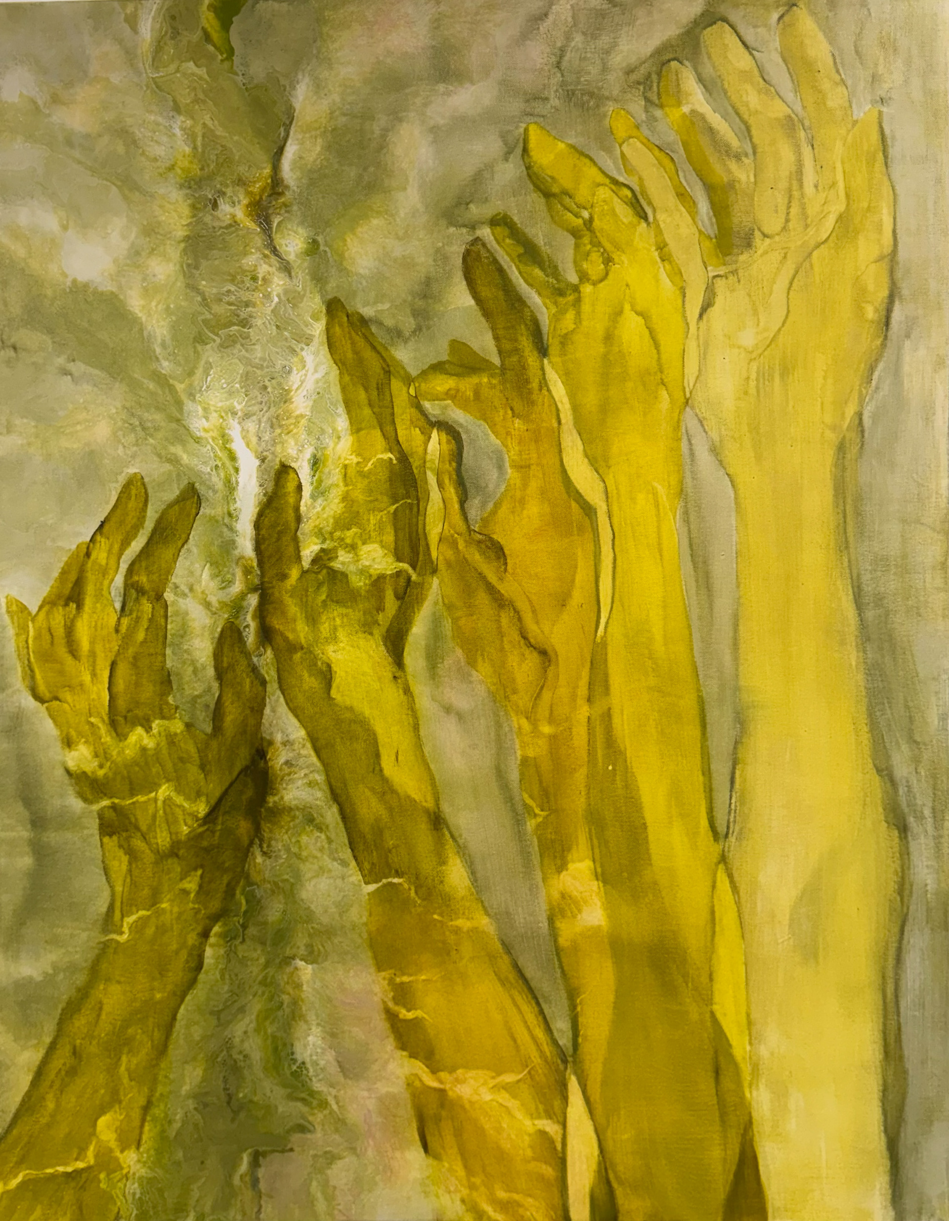 Warm yellows rise upward in layered, translucent forms, creating a sense of motion that feels both collective and individual. Each hand overlaps the next, shifting in tone from deep ochre to pale gold, echoing the rhythm of bodies reaching toward a shared point of light. Soft washes hold the space around them, suspending the movement in a quiet, glowing atmosphere.