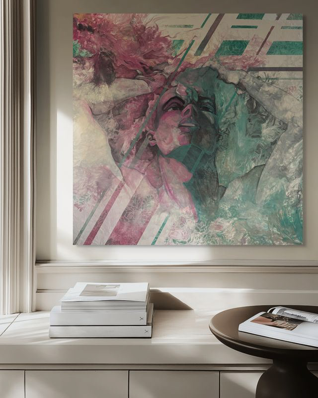This piece started with color. I was thinking about spring—cherry blossoms, green and pink, the way everything feels full and alive. But once I poured the paint and stepped back, the feeling changed. The colors started to say something else—something about gender, softness, strength, and the spaces between. I kept the figure androgynous and open, not fixed in any direction. The geometric lines came later. They gave it tension, like structure pressing in on something fluid. I don’t know if the figure is falling or rising. But to me, that’s the point.