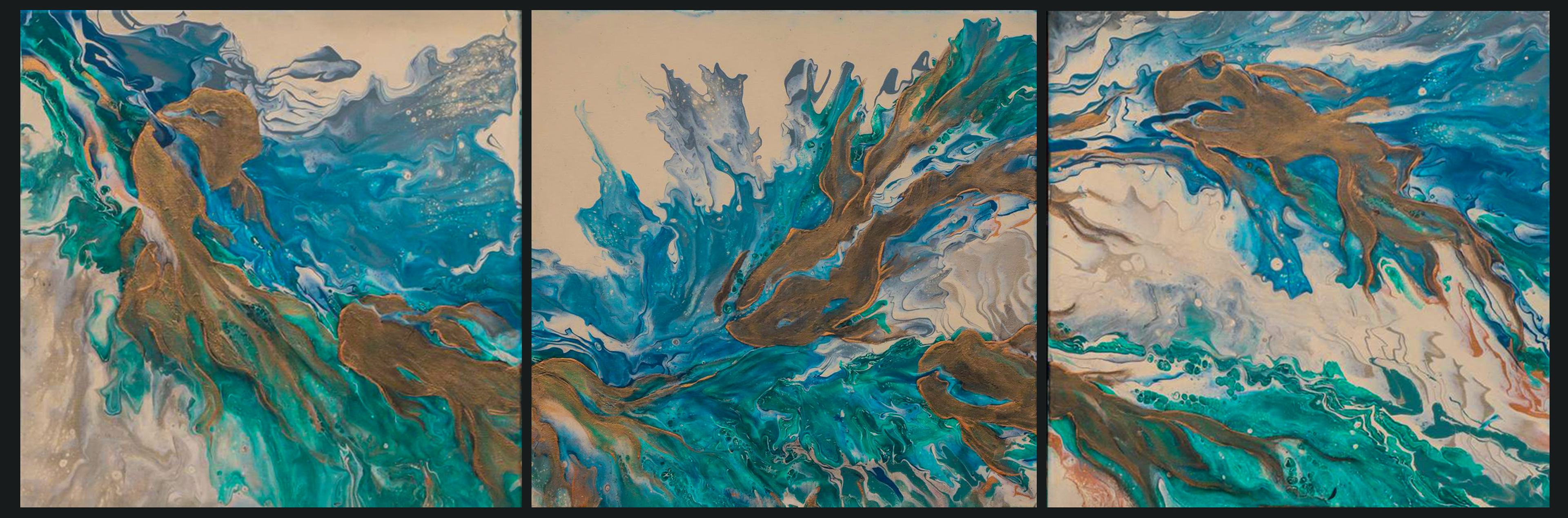 This triptych moves like a current from left to right. Layers of blue and green create a flowing rhythm, while copper forms intersect to set up a counter-rhythm. Concave and convex shapes meet and shift, so the panels hold two forces in dialogue.