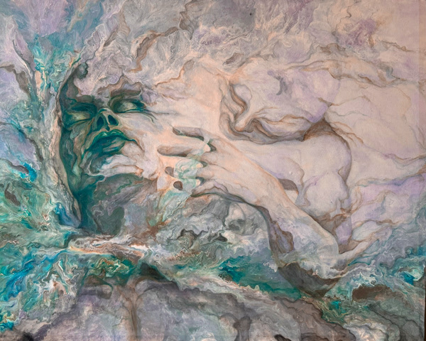 Cool lavenders and blues combine with neutrals, creating a contrast in temperature that holds calm and unease together. Shifts in tone give depth, and the biomorphic patterns of the pour, defined with line, articulate the figures to establish the tension between presence and intrusion.