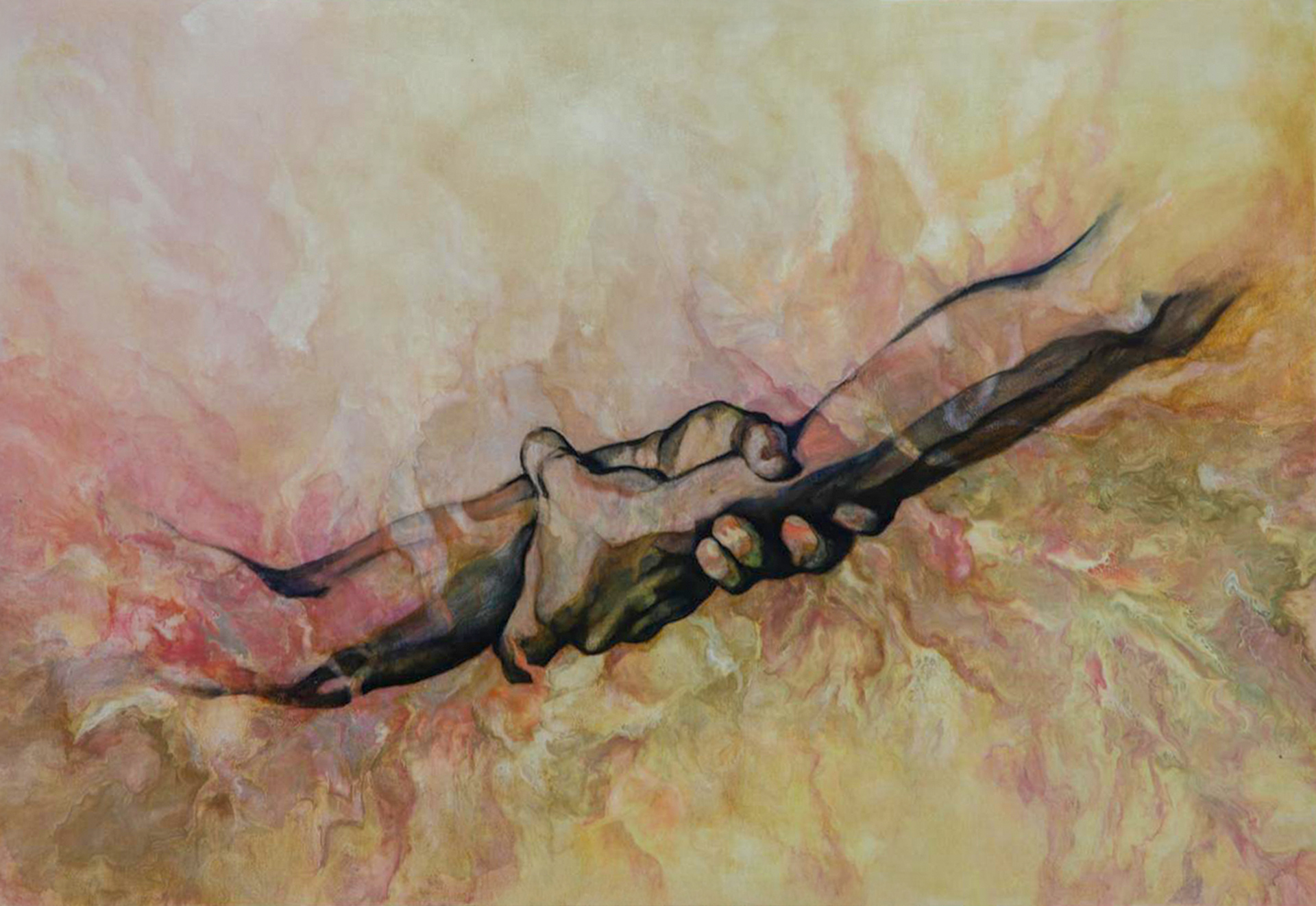 Warm yellows and pinks build through layered washes, some pulled back and others saturated to create depth. From the center, energy moves outward in both directions, while two arms reach inward, meeting in a firm clasp that anchors the composition against the current.