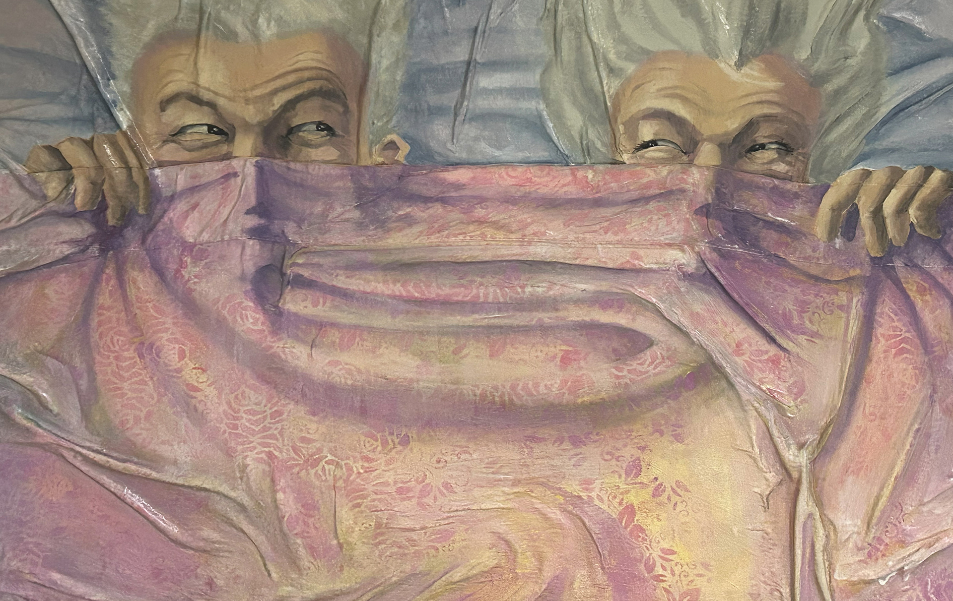 I made this piece for a show about sustainability. The canvas is old bed sheets soaked in drywall powder and caulking paste, stretched over a salvaged frame. When it dried, I followed the folds and started to see a mischievous old couple tucked beneath. They’re playful, still connected to something youthful, but grounded in the life they’ve built. It became a piece about emotional sustainability and what it takes to stay close over time. Strange, lighthearted, and built to last.